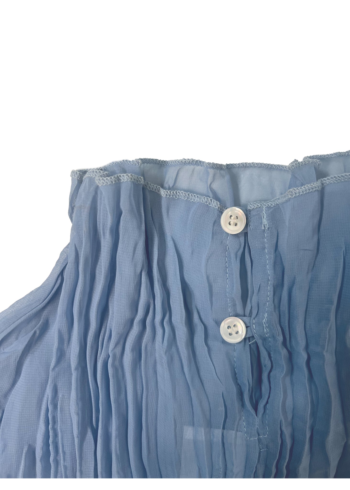 The top is a single layer, sheer finish that gently skims your curves. The feel is luxurious and comfortable, as the pleats expand around your body. It’s a unique layering piece that is effortless under blazers, sleeveless dresses, or paired with your our Rue Skirt for a monochromatic look.