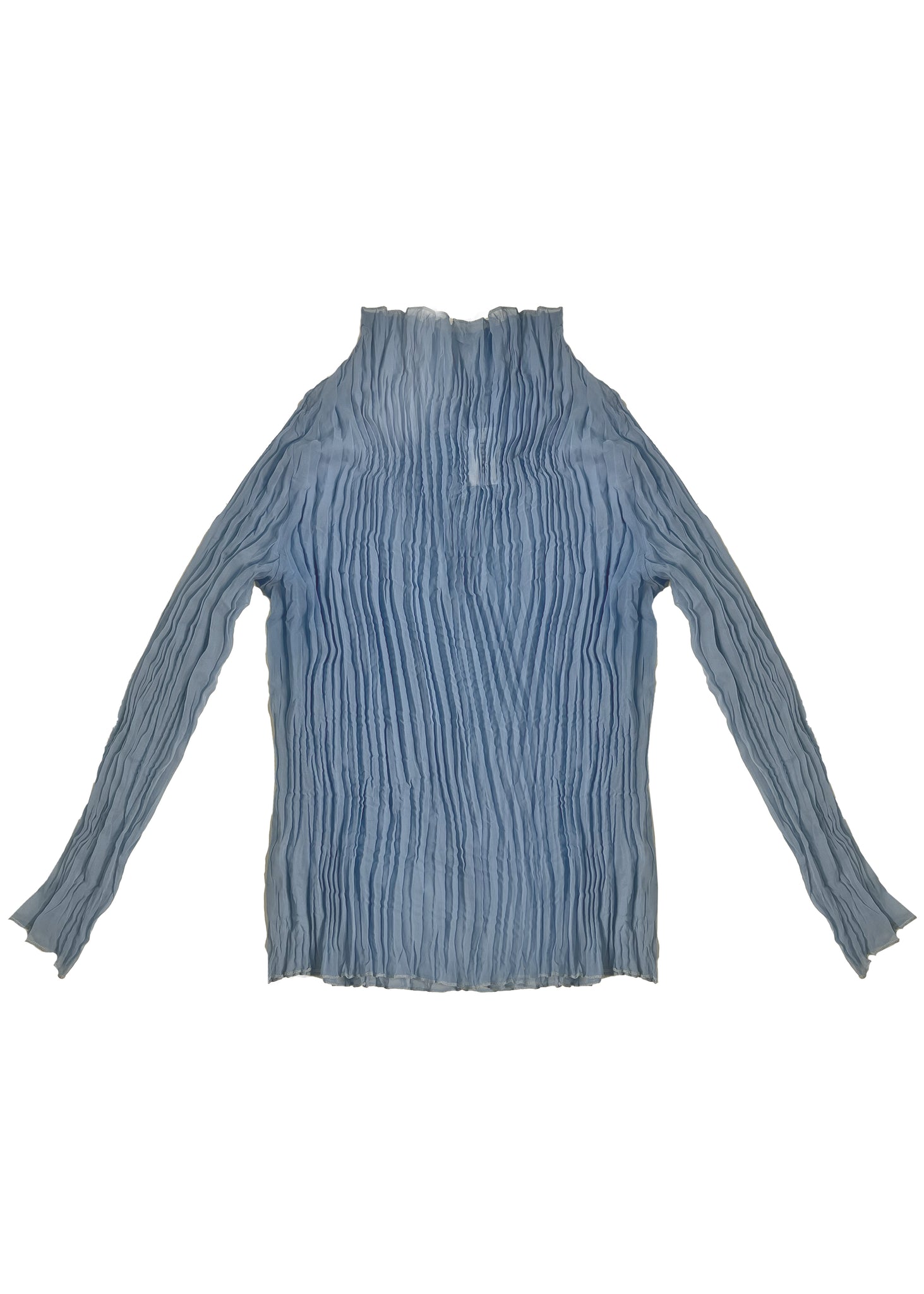 Our pleated long sleeve top delivers a modern edge with a funnel neck design. The pleating is crafted by hand. Each item is individually created and handcrafted in Los Angeles, California.