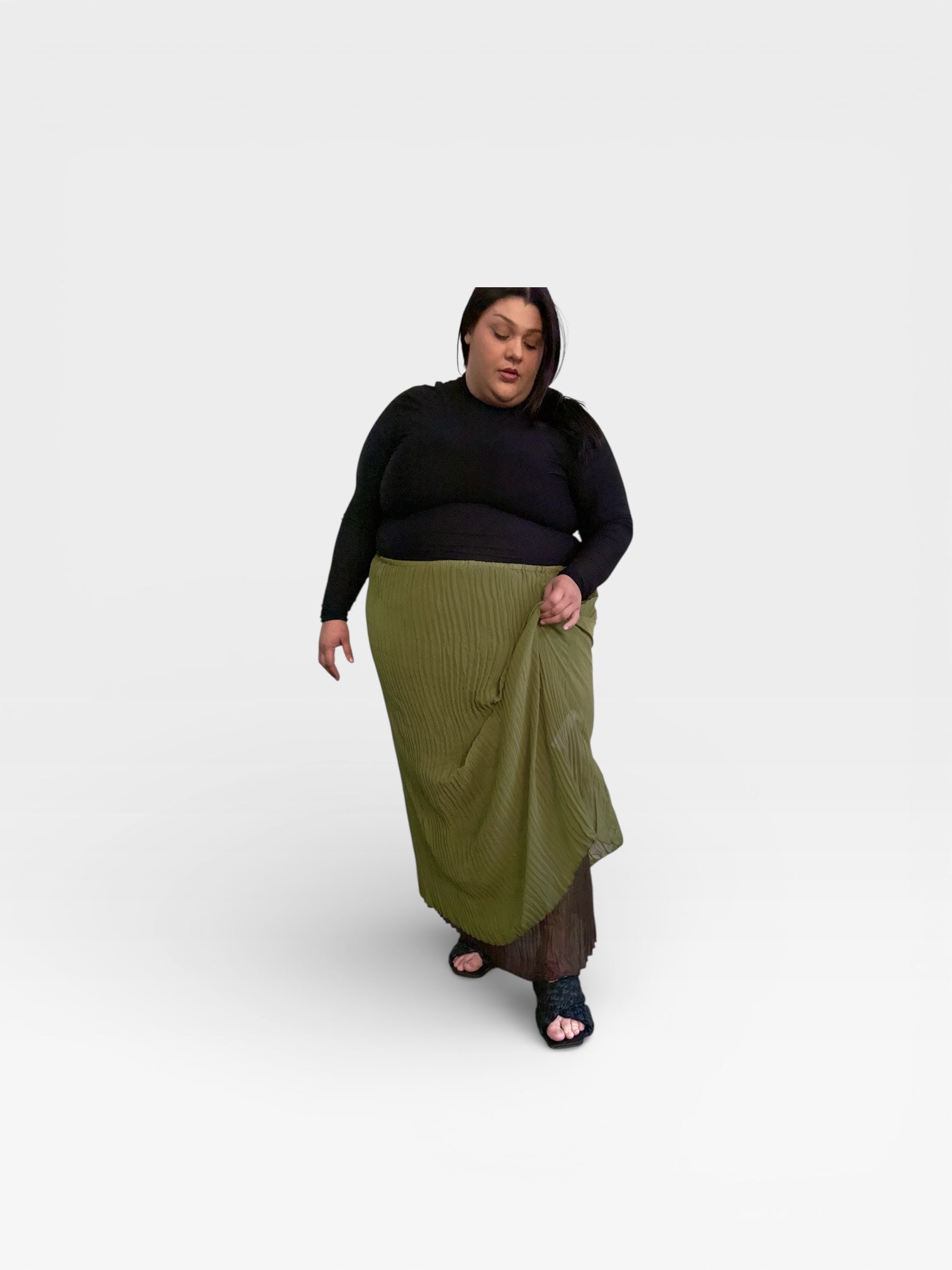 Perfect addition to you BAACAL pleated pieces. Introducing Rue, our elegant hand pleated midi length skirt made for any occasion. We brought back the most requested skirt and funnel neck. The olive green/ brown is reversible for double the 'fits. Crafted with precision, this column skirt compliments your curves as the pleats expand and contract in all the right places. Never clingy- the feel is soft and easy. Double layered. Pair it with the pleated mock neck or cardi for the perfect monochromatic look.