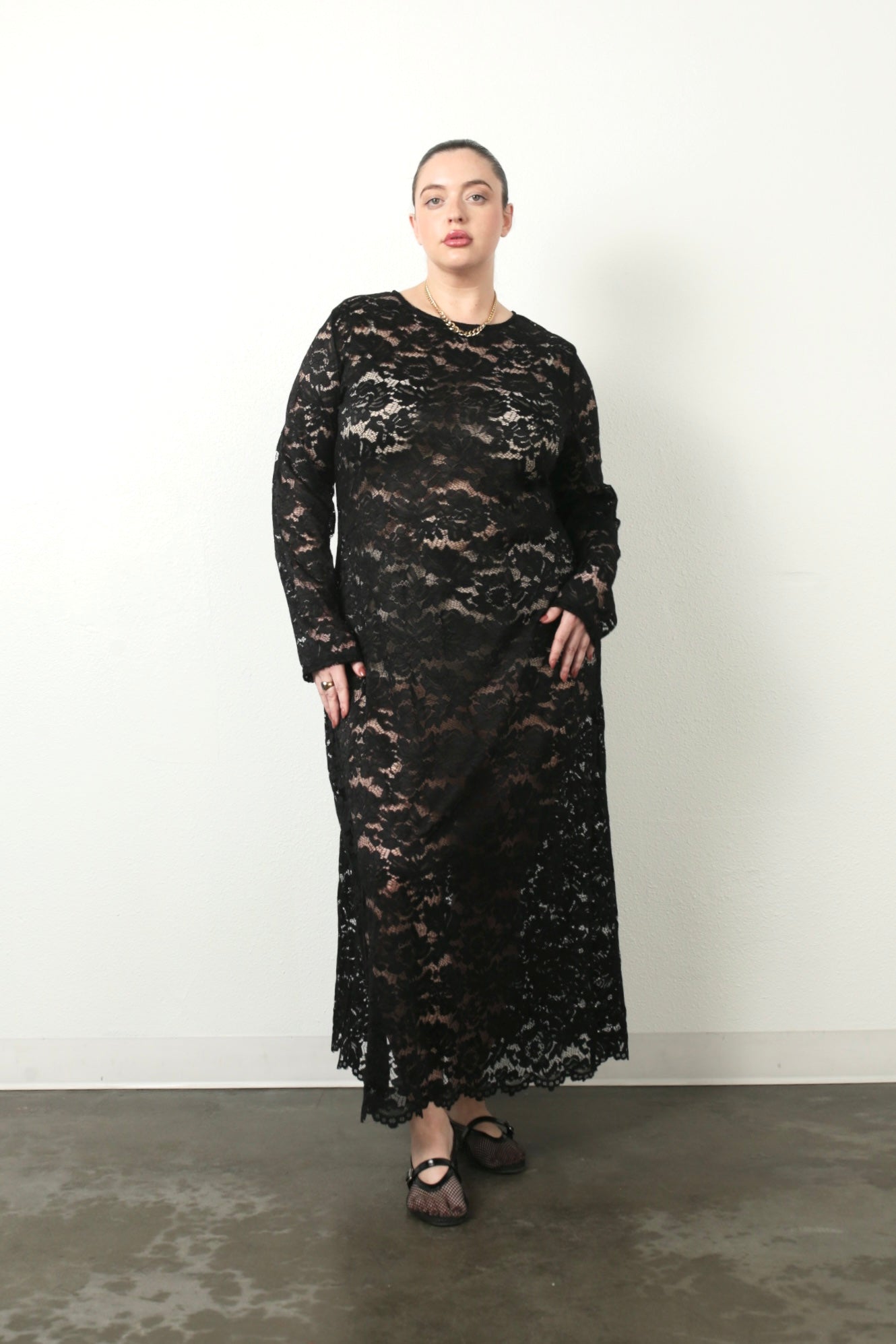 Sheer perfection. Elegant and effortlessly dramatic, this full-length lace dress is designed to make a statement. Designed with a classic round neckline and long sleeves, this piece balances romance with modern ease. A beautiful scallop edge detail accents the hem of this classic yet edgy, effortless long sleeve lace dress.